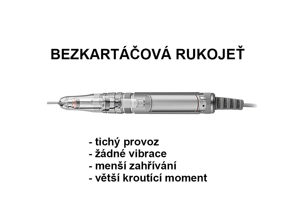 Díky tomuto řešení odpadá tření, jiskření, nadměrná produkce tepla a redukuje se opotřebení uhlíkových kartáčů a komutátoru. V praxi to jednoduše znamená to, že se rukojeť nebude kazit i při každodenním několikahodinovém zatížení u profesionálek manikérek a pedikérek. Jedná se tedy o velice spolehlivou celokovovou rukojeť, která má navíc tu výhodu, že je opatřena velmi dlouhou šňůrou, což je velice pohodlné a praktické.
