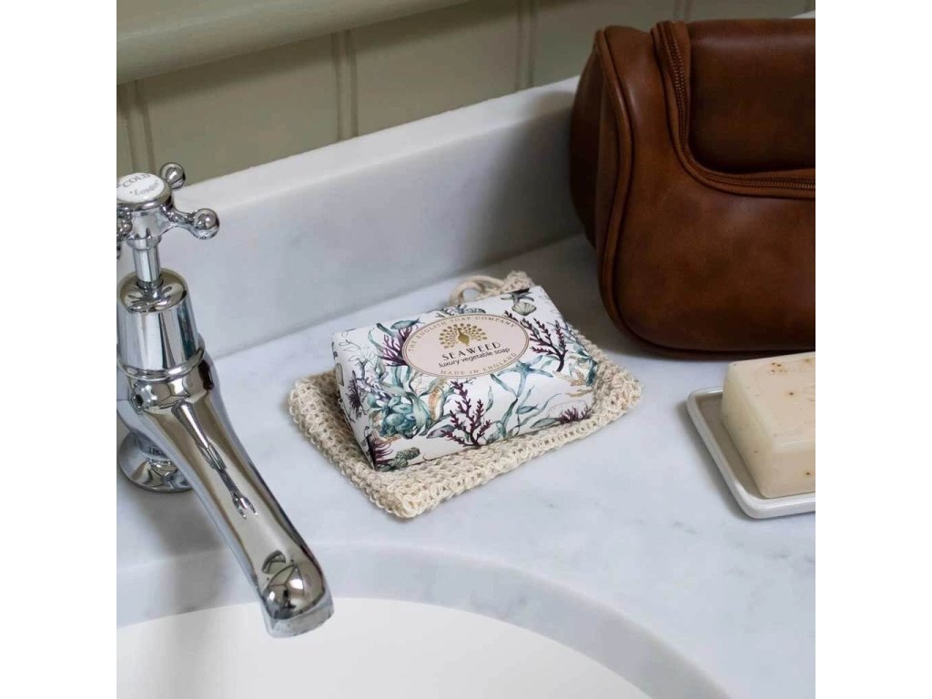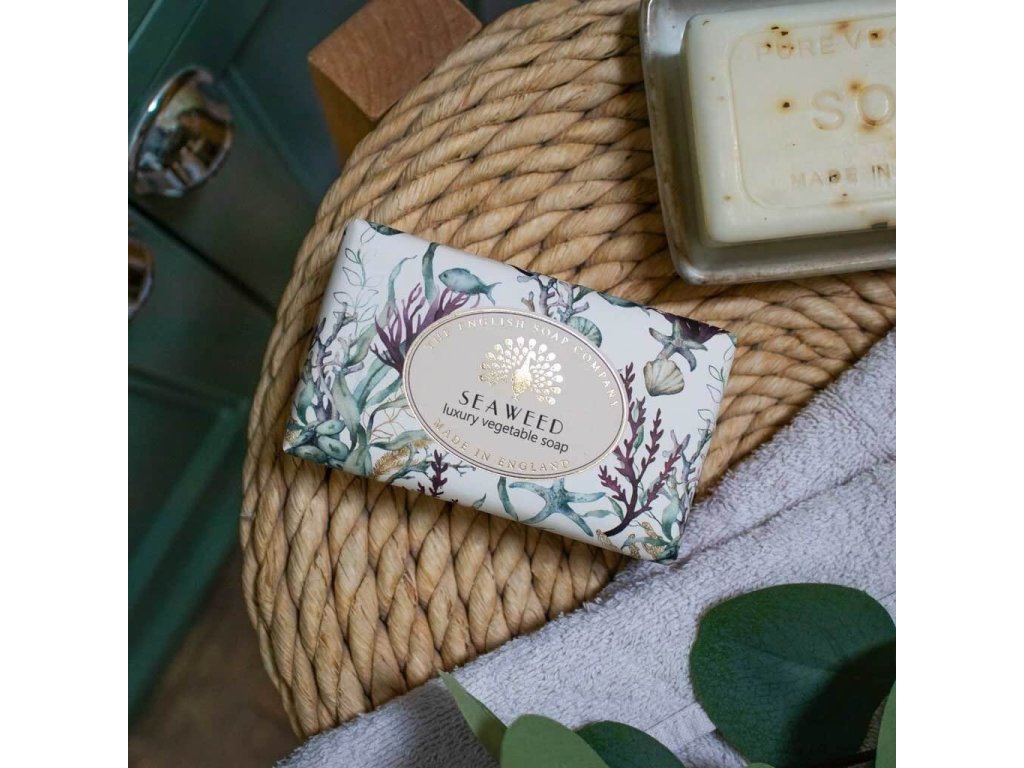 Mýdlo je baleno v papírovém obalu, zdobeném nádhernými uměleckými ilustracemi.