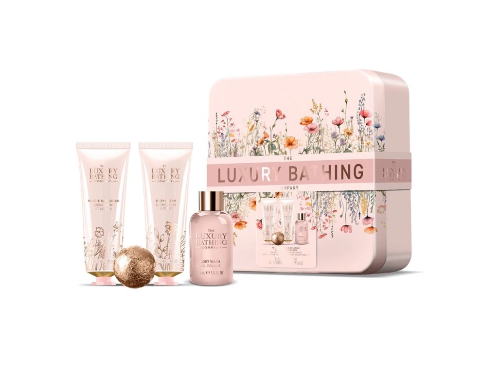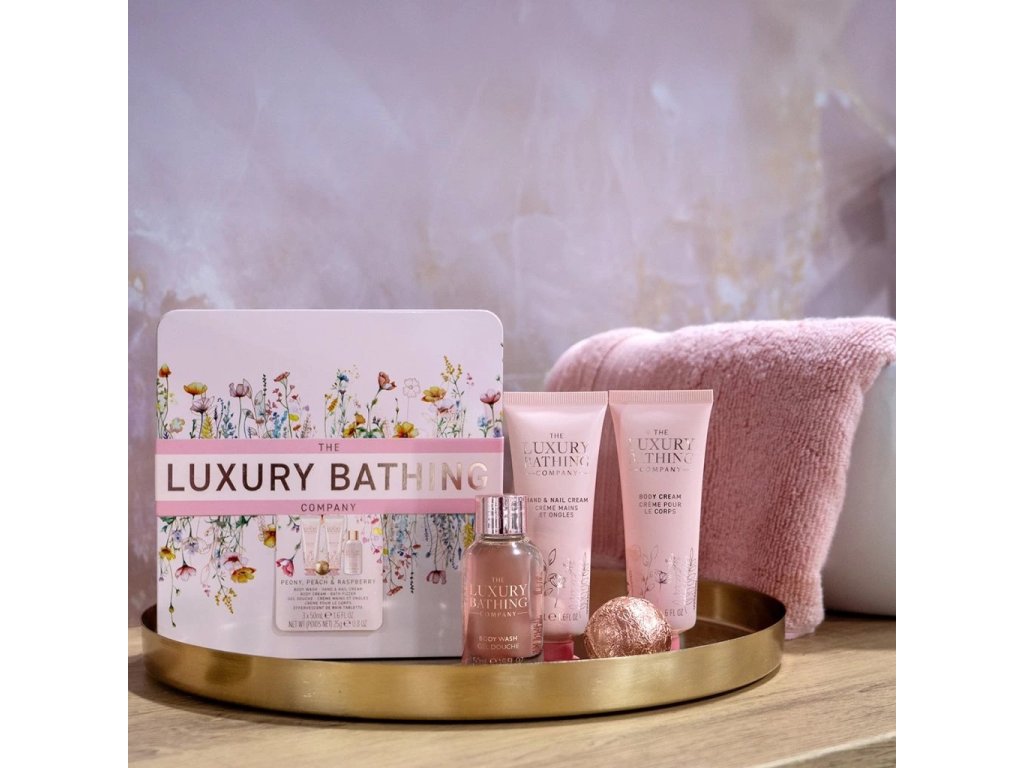 Radostná kolekce Floral Finesse, inspirovaná květinami anglické zahrady, nabízí produkty v něžném, elegantním designu. Jemné kvítky v kombinaci s pudrově růžovou barvou a zlatými detaily zdobí dárková balení vytvářející tuto nadčasovou kolekci. Ovocná vůně mandarinek a malin s květinovými tóny pivoňky a růže, zakončená teplým základem sladkých broskví osloví všechny ženy 40+.