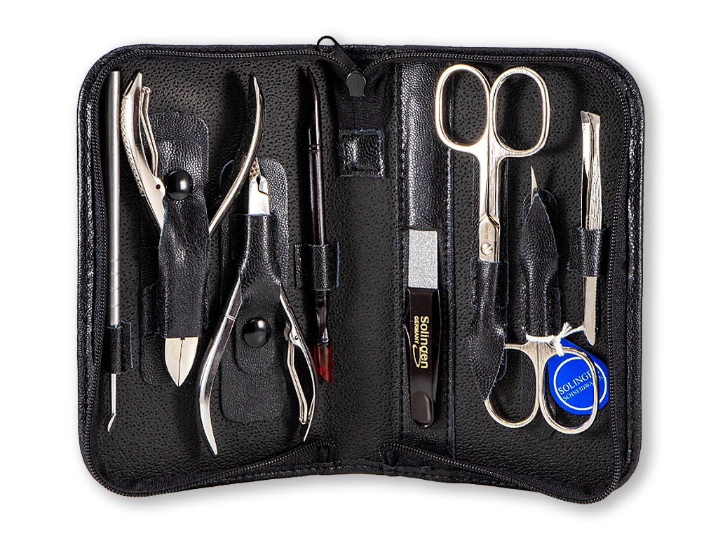 Velikost sady se hodí pro pravidelnou domácí péči a nemusíte se obávat, že některý díl této sady ztratíte. Všechny nástroje jsou přehledně uloženy v černém koženém pouzdru uzavíratelném na zip. Kožené pouzdro je měkoučké a velmi příjemné na dotyk. Nástroje jsou vyrobeny z kvalitní nerezové oceli v matové úpravě. Nerezové výrobky značky Solingen jsou proslulé svou dlouhou životností.